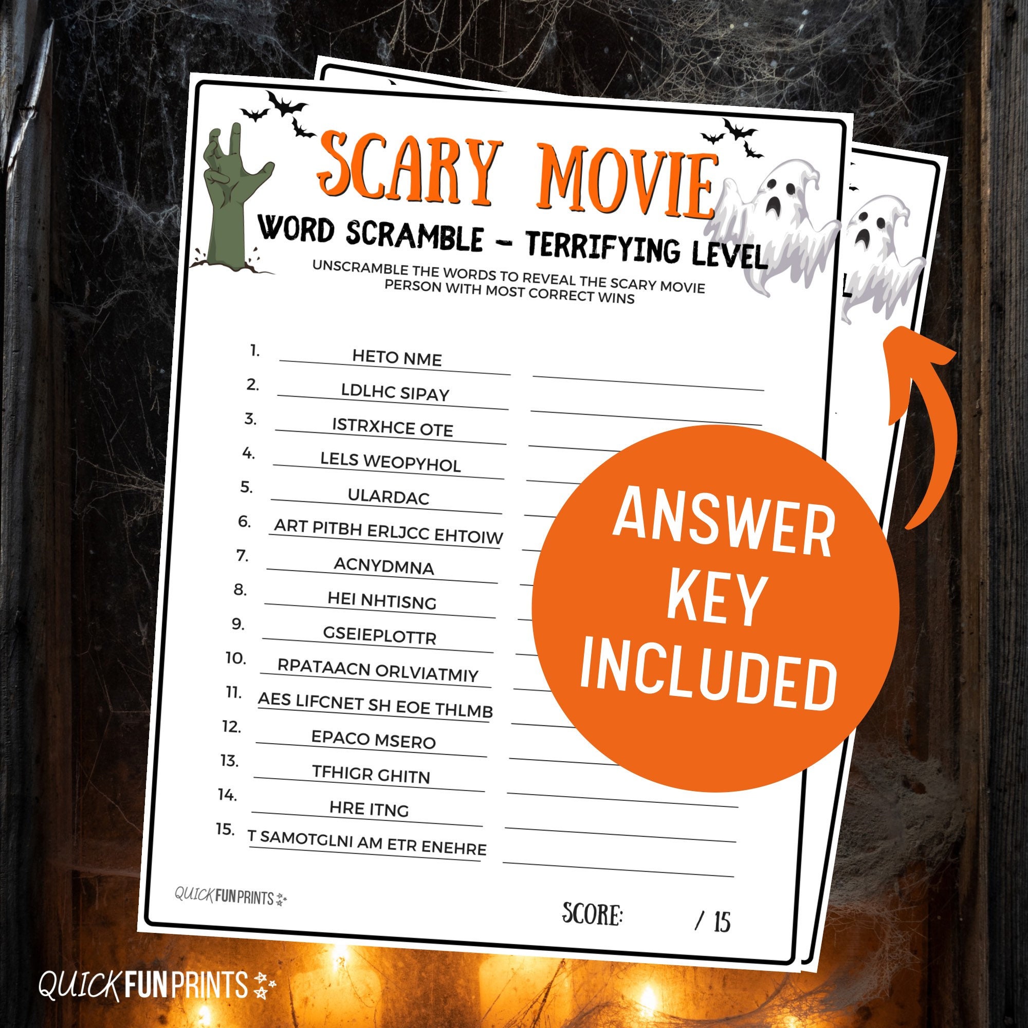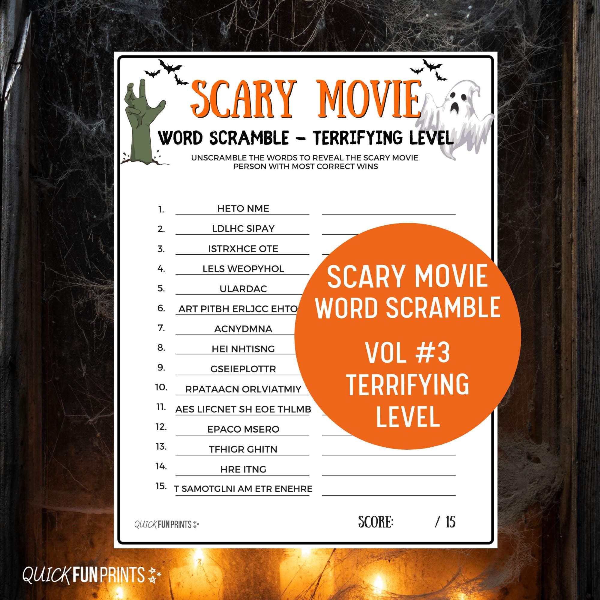 Halloween/Horror Movie Word Scramble - Terrifying Level. Halloween Word game, halloween printable. Halloween game great for older kids or adults to play this Halloween.