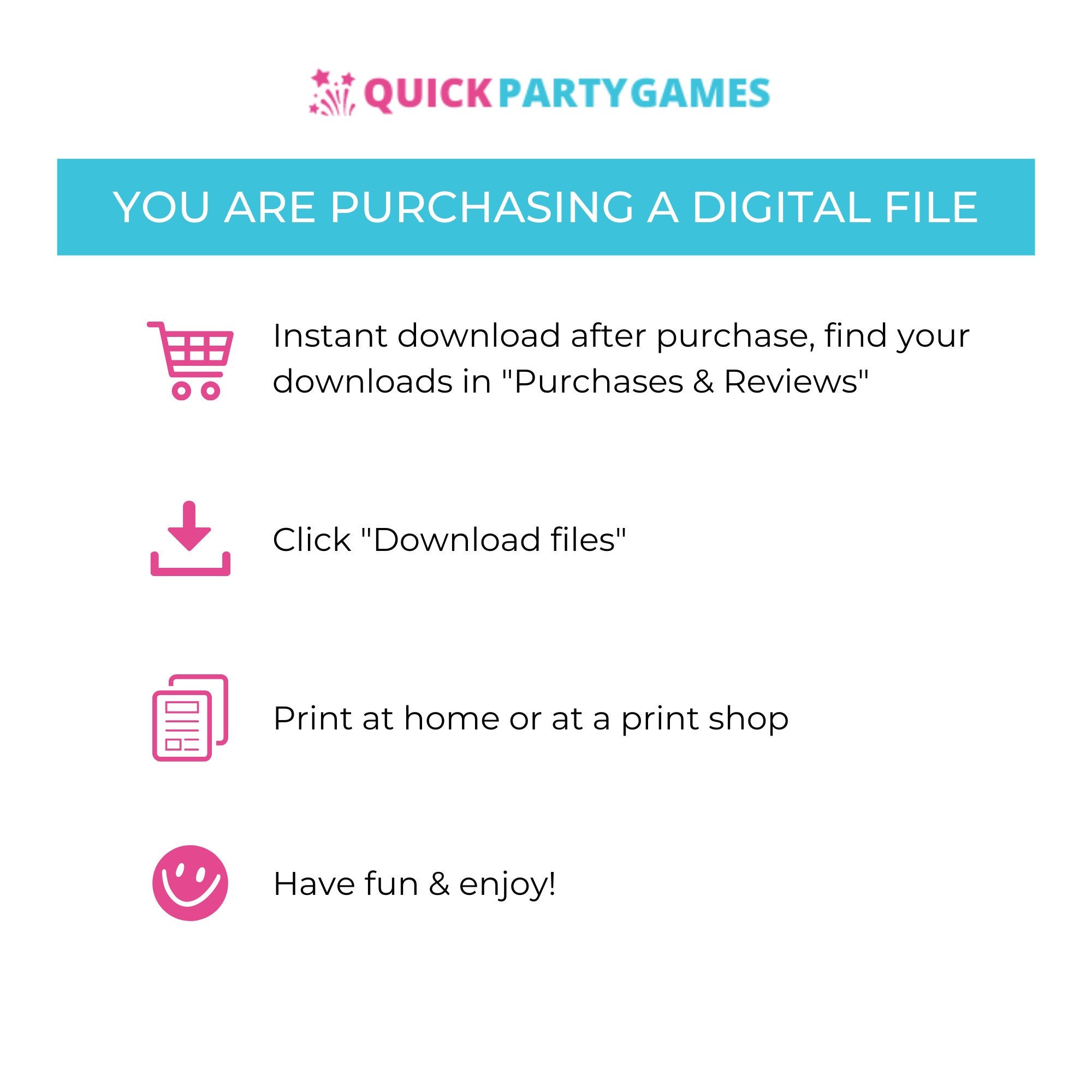 LISTED HERE - https://www.etsy.com/QuickPartyGames/listing/1196586685