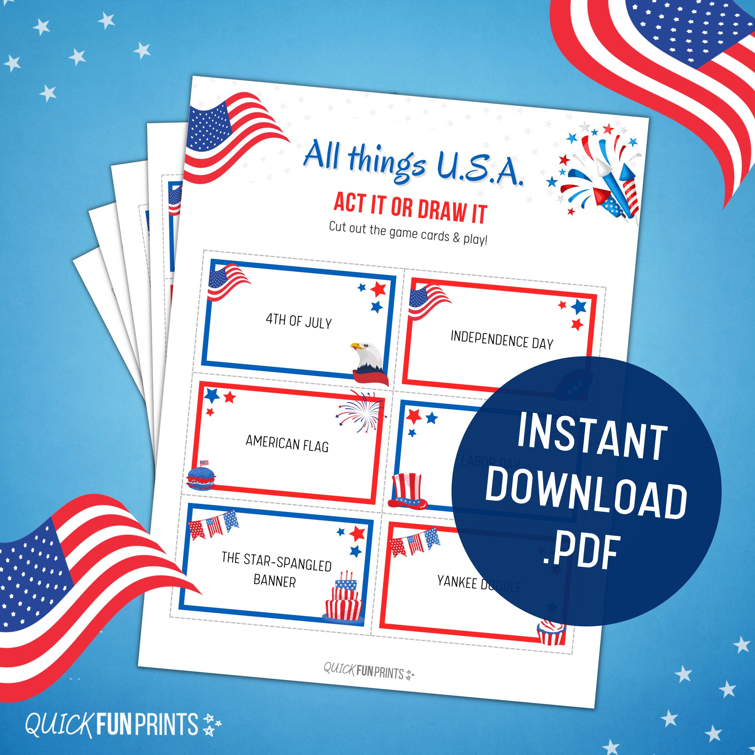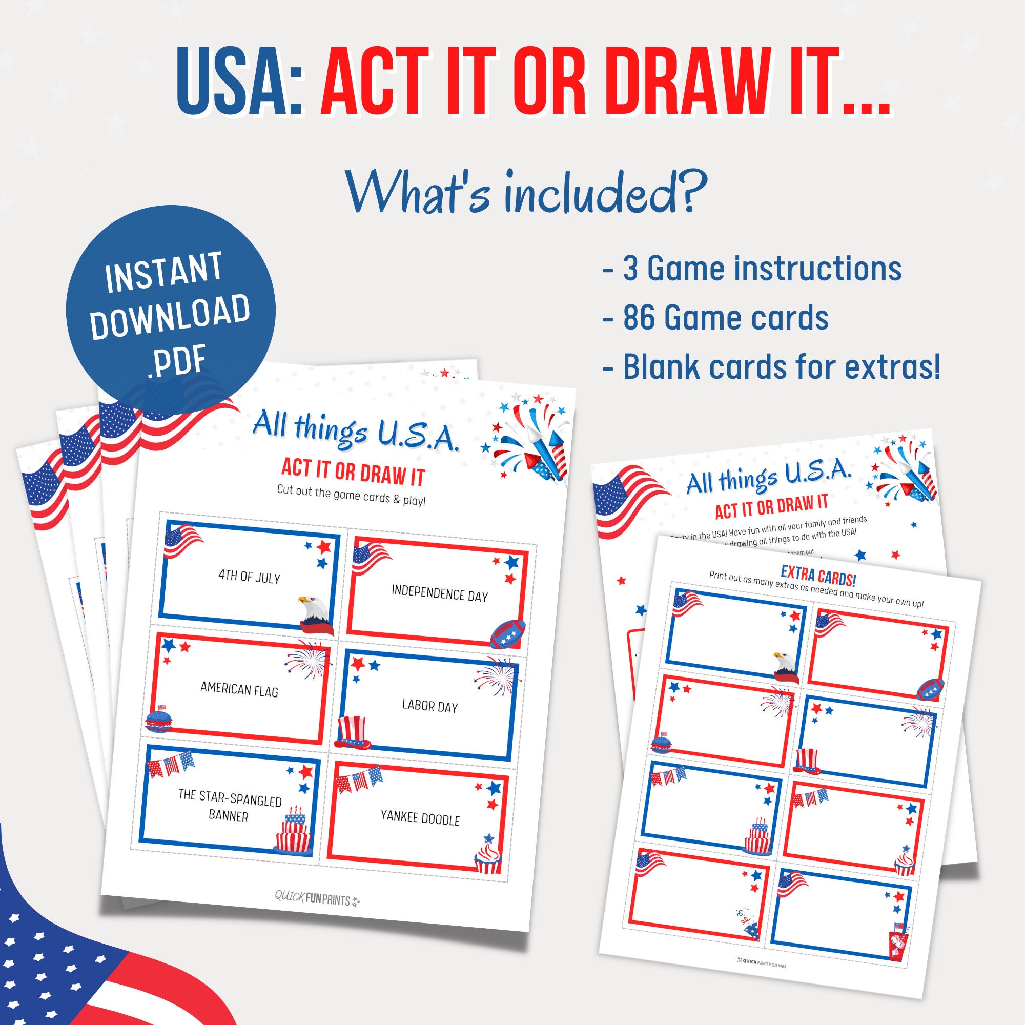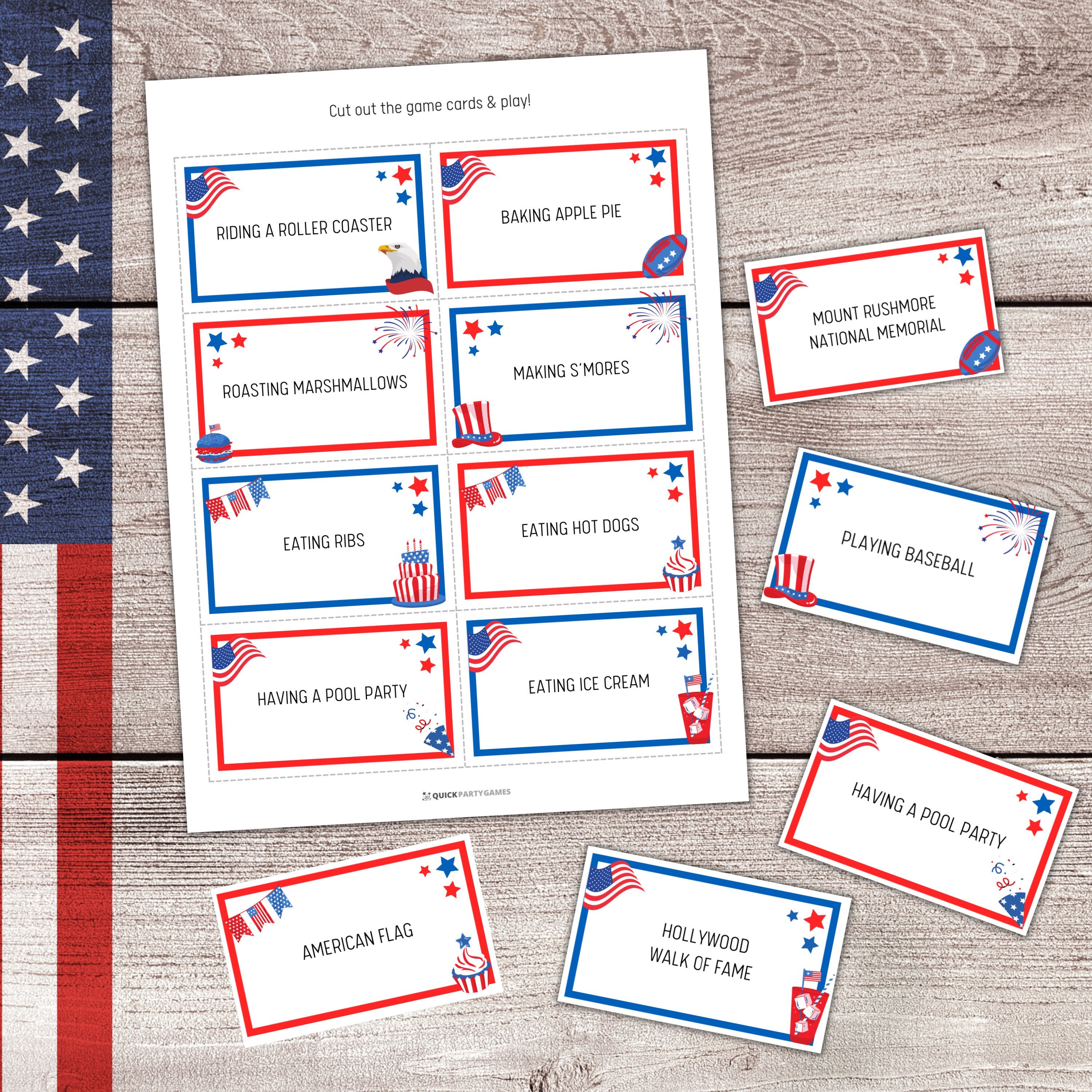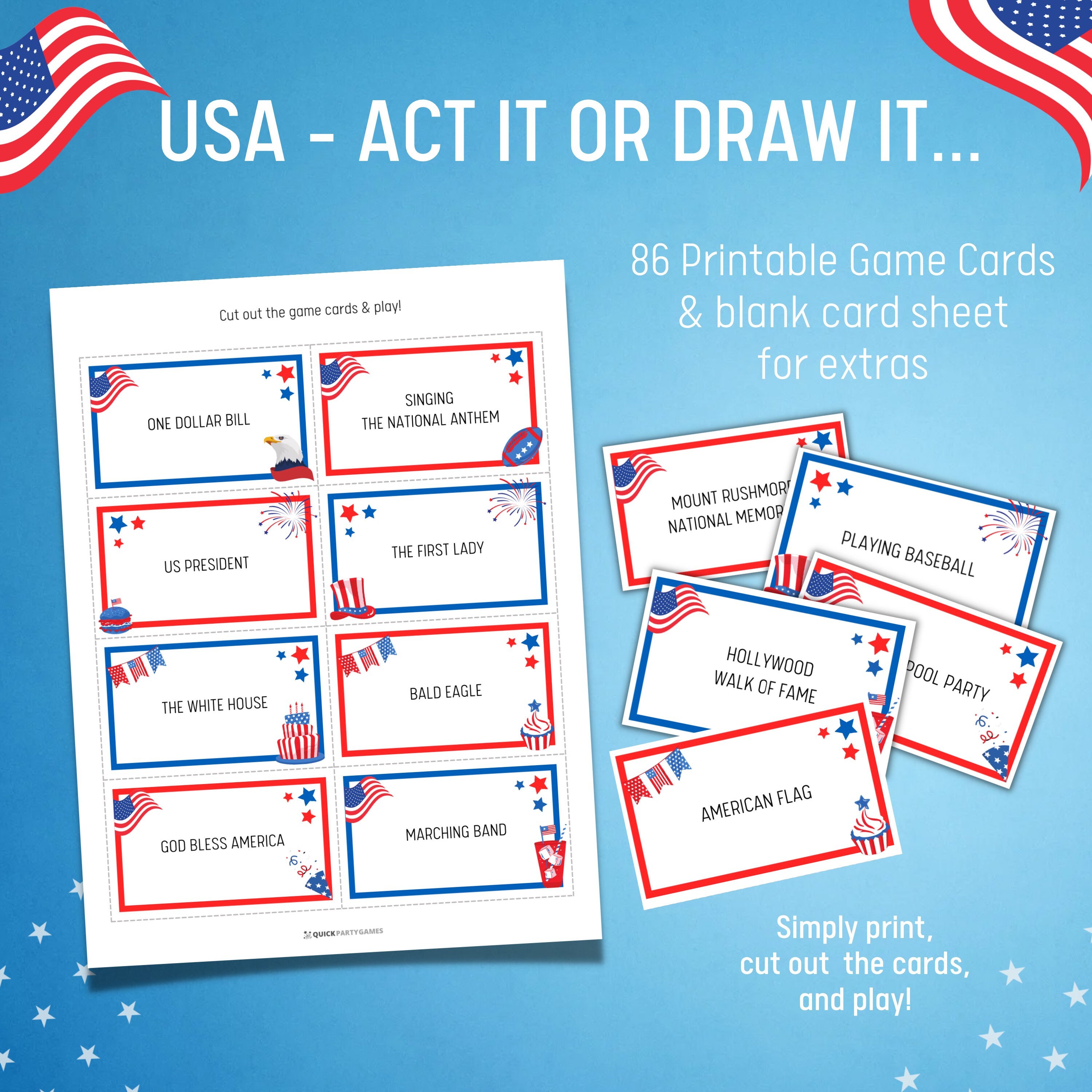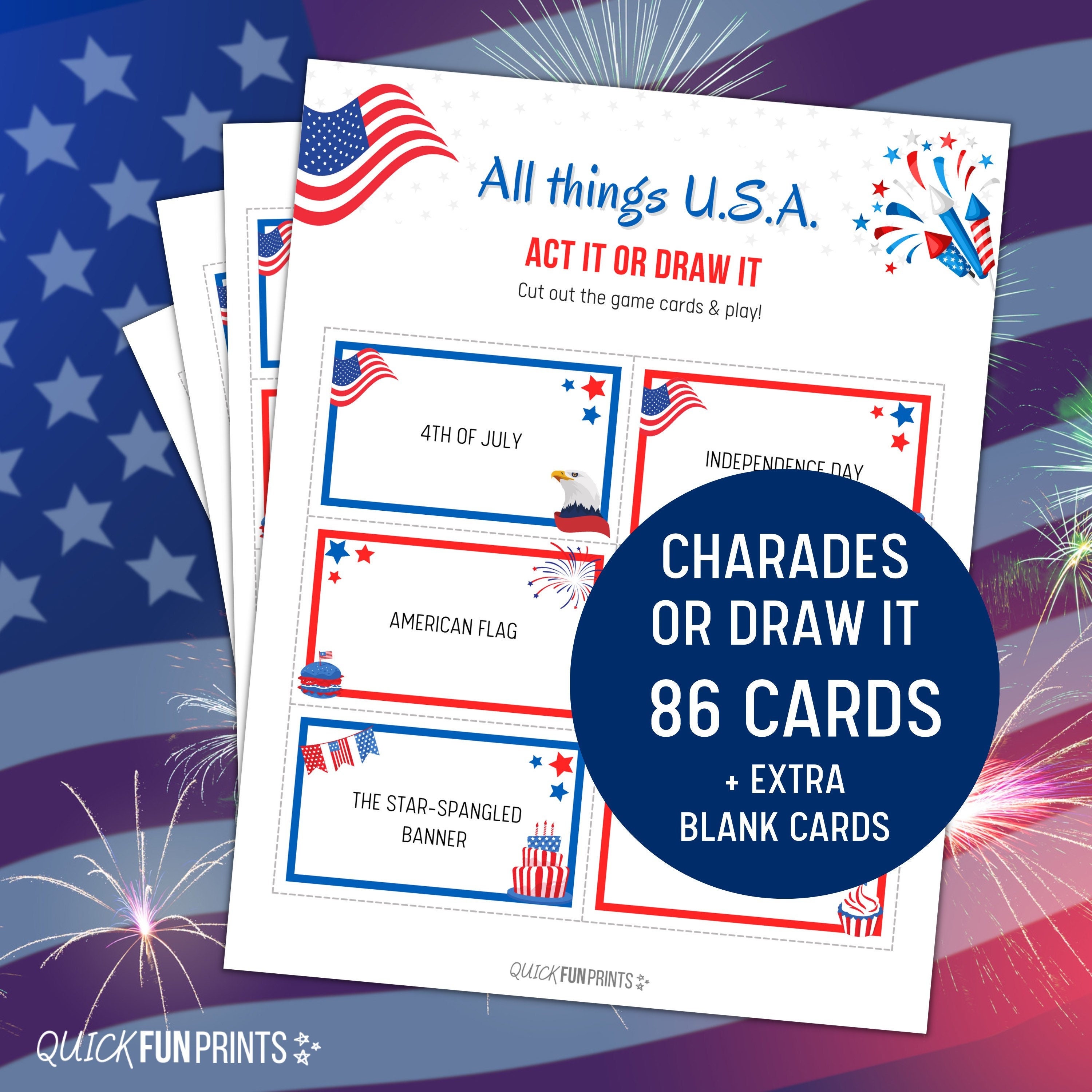 USA Patriotic cards to pick and act out or draw - great for kids and adults to play on any USA holiday celebration or party.