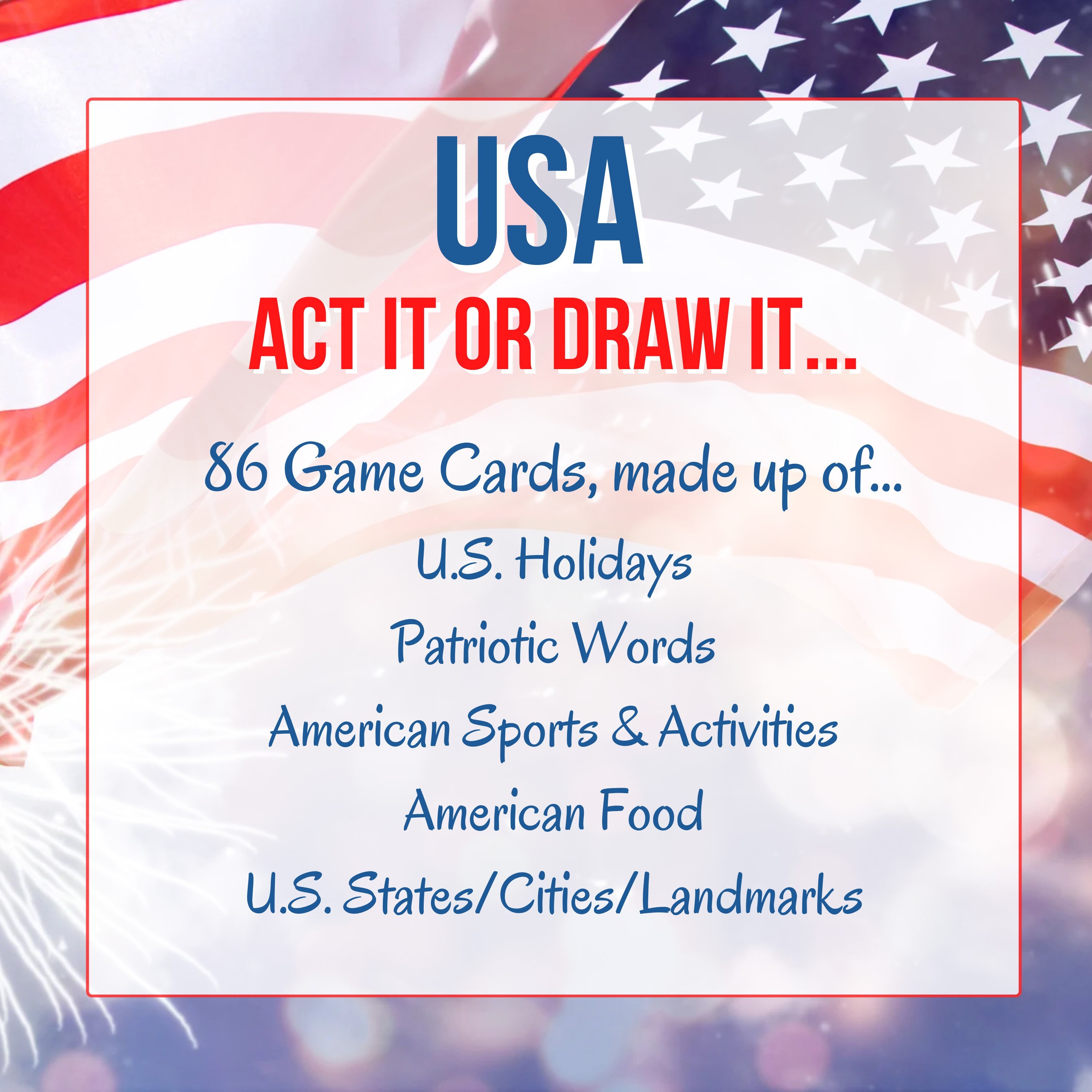 - 86 USA themed game cards - Patriotic cards, USA sports & activities, American food, U.S States, cities and famous landmarks!