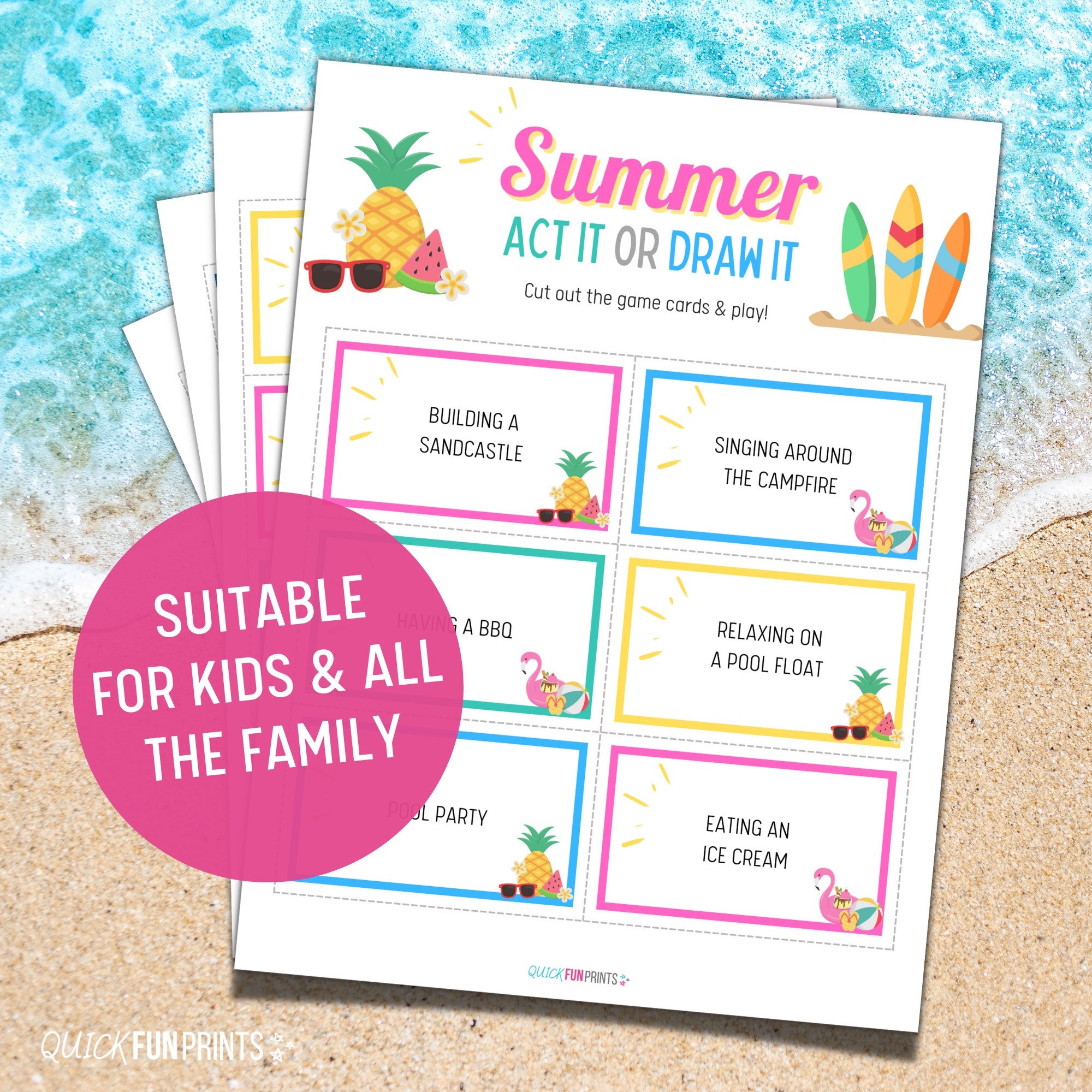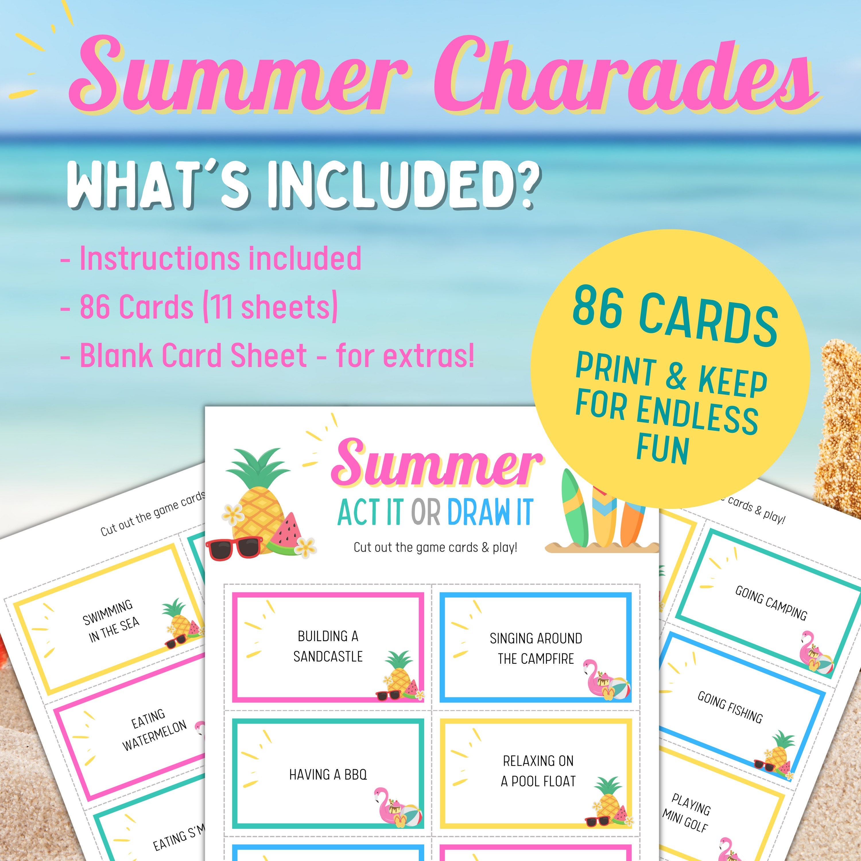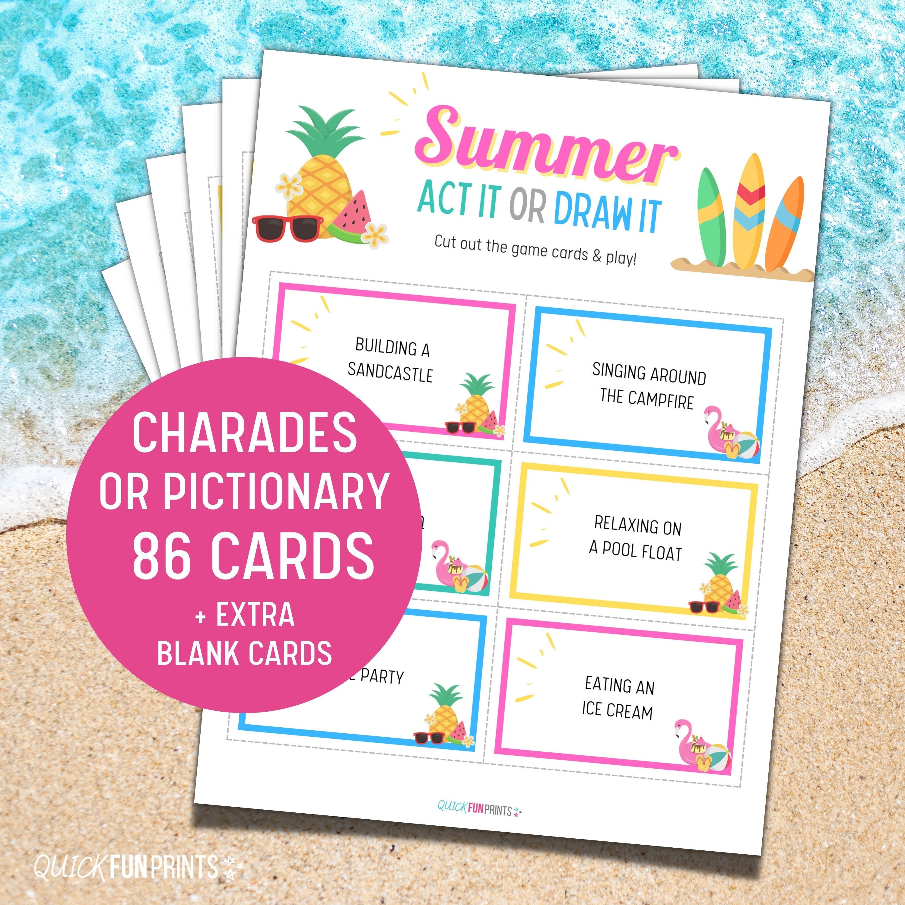 Summer themed cards to pick and act out or draw - great for kids and adults to play together