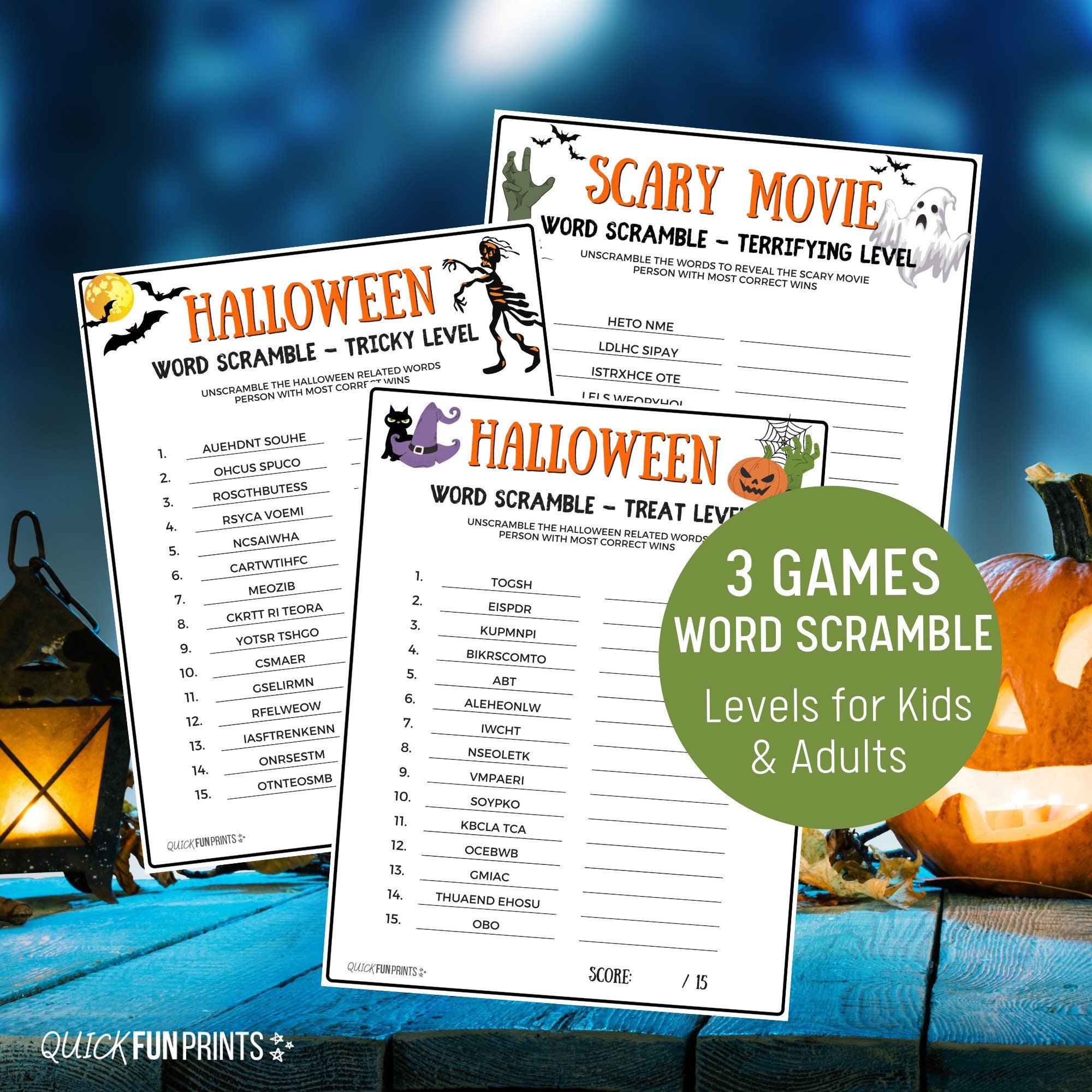 - Word Scramble - 3 Game Levels included: Treat, Tricky & Terrifying