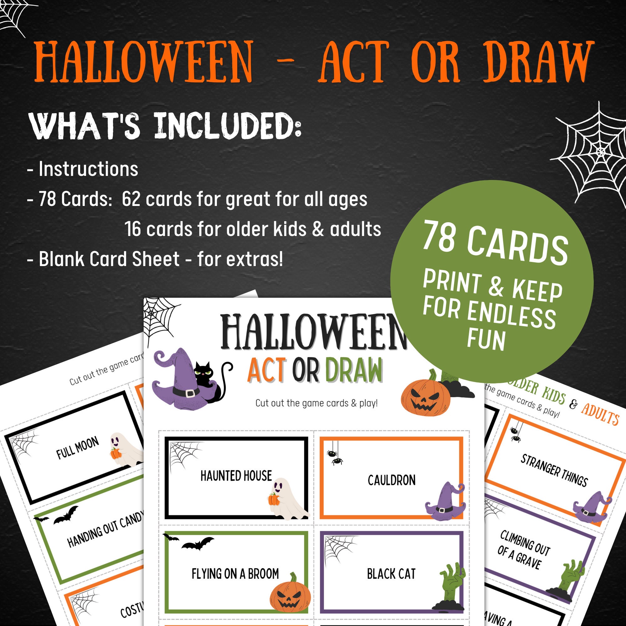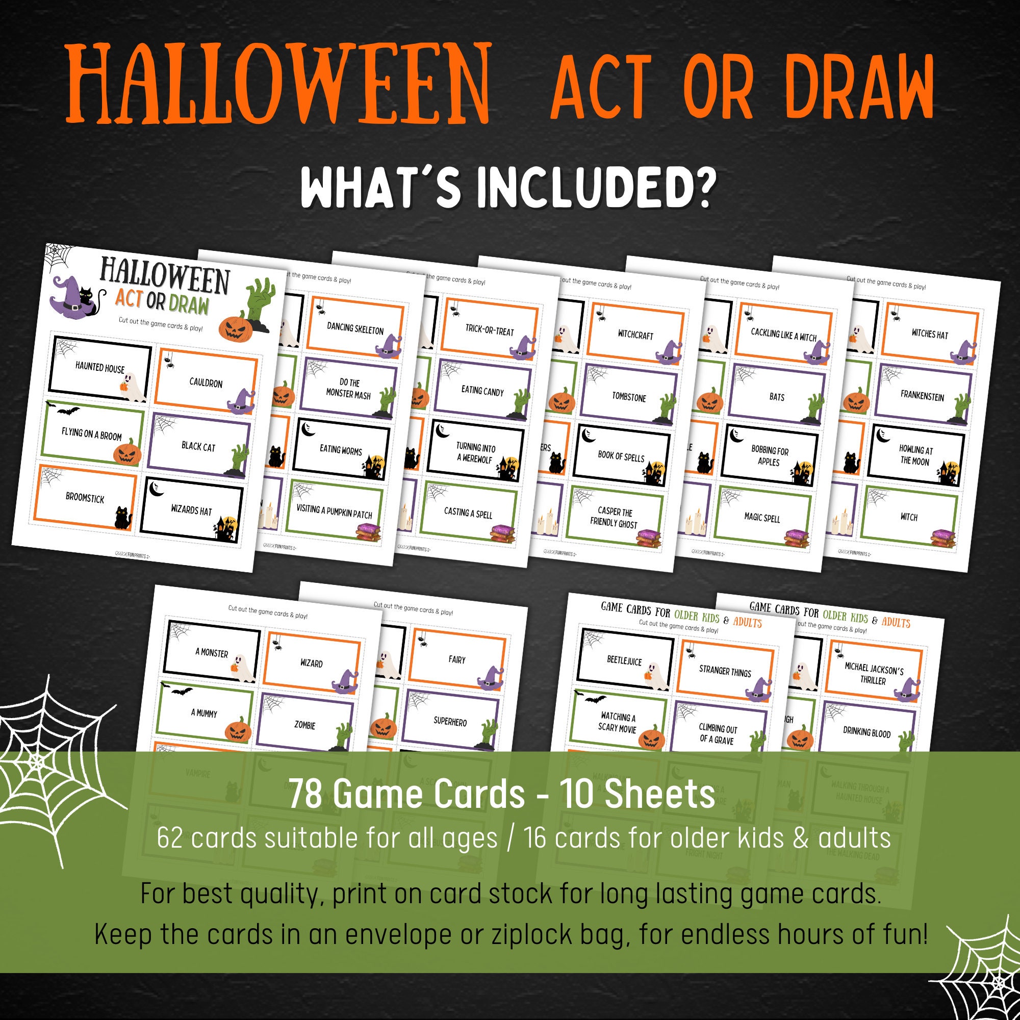 - 78 Halloween themed game cards - 62 are suitable for all ages, 16 cards great for older kids and adults