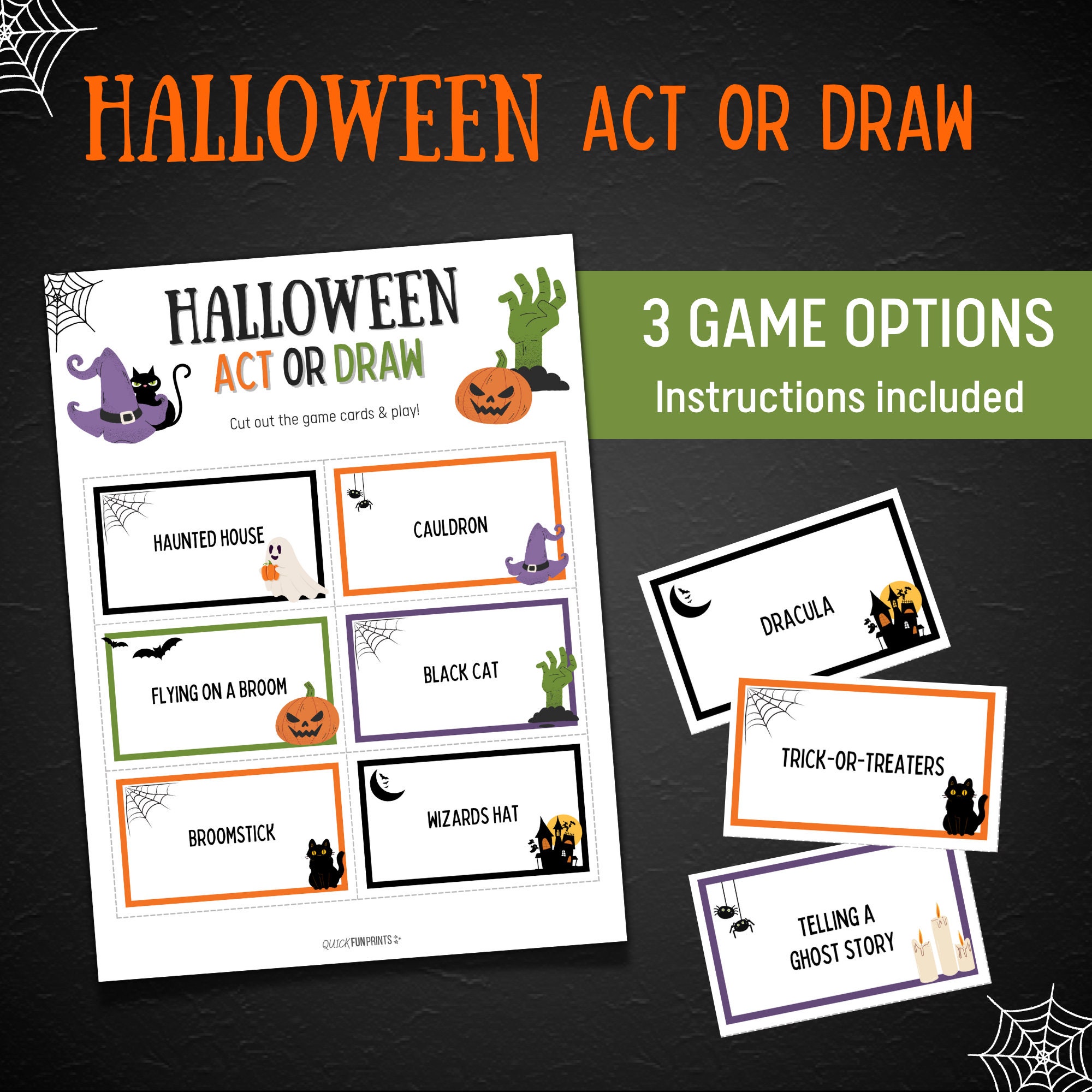 3 Game options included to get your family and friends laughing and having fun during your Halloween party