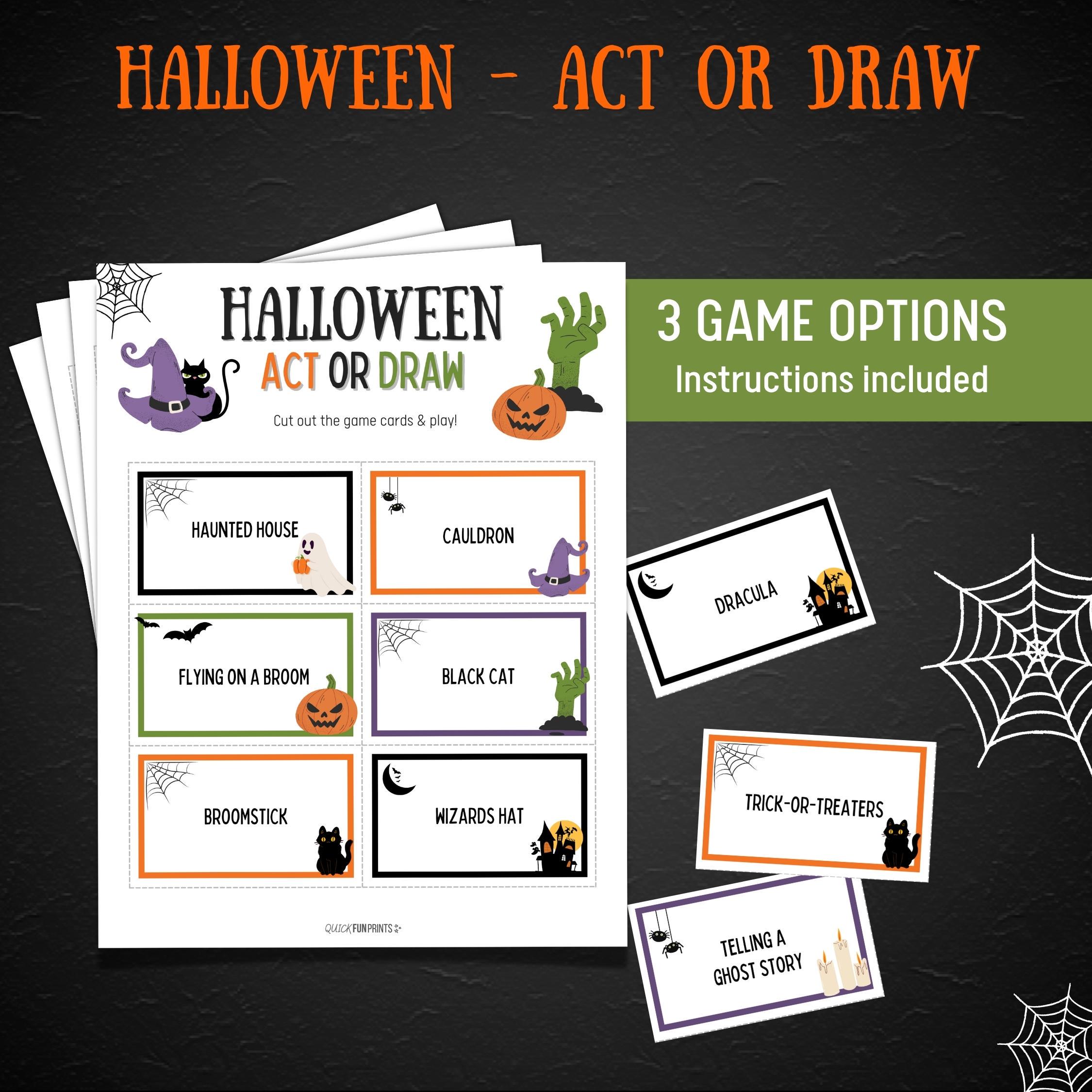 Halloween themed cards to pick and 'act out' or draw - great for kids, adults and all the family to play together at Halloween