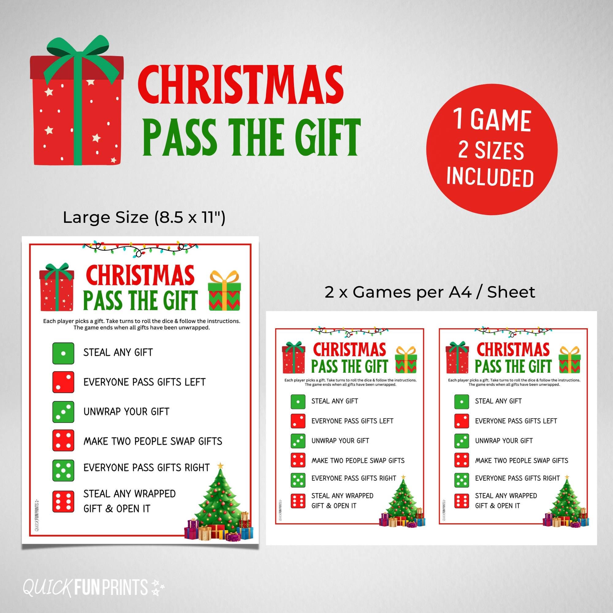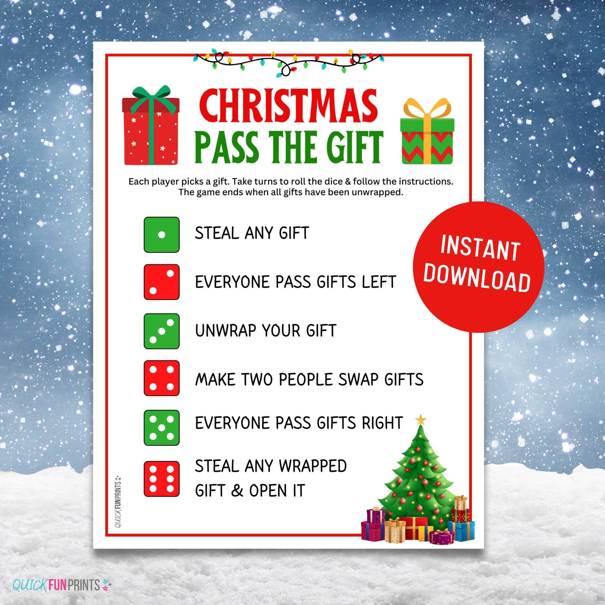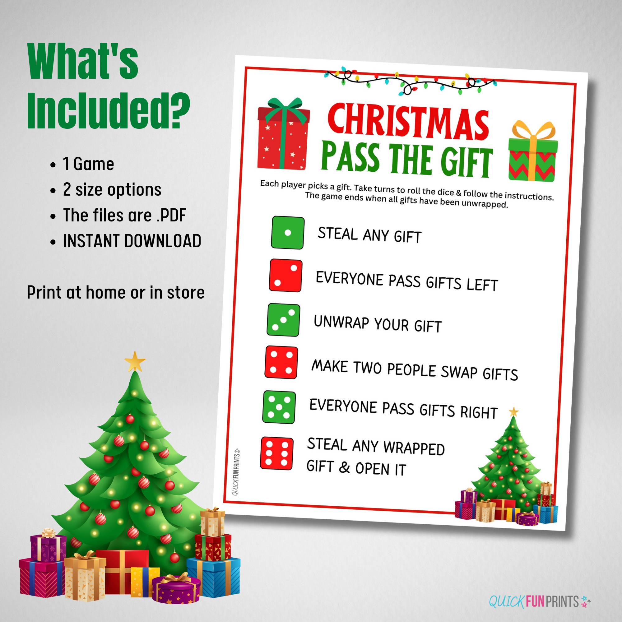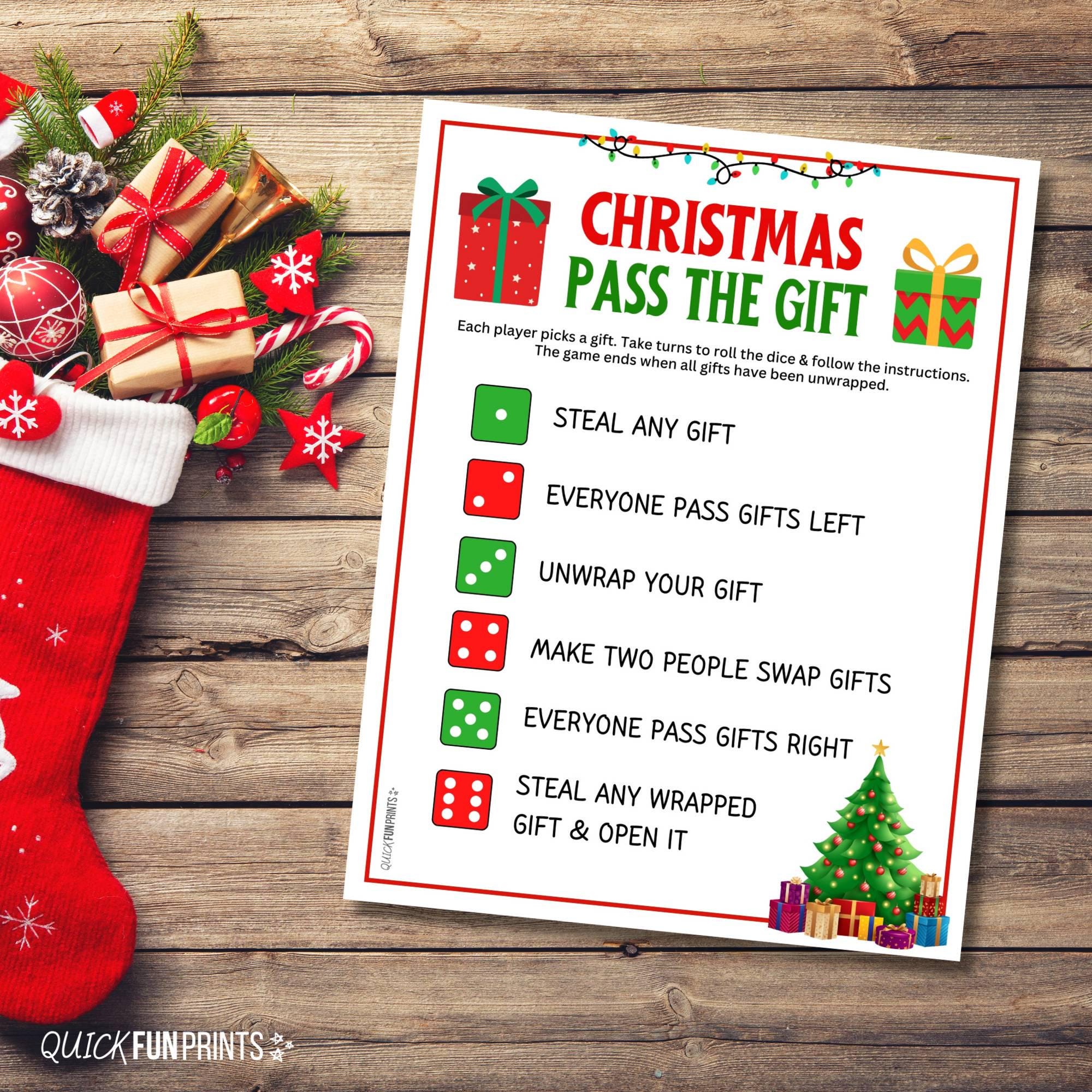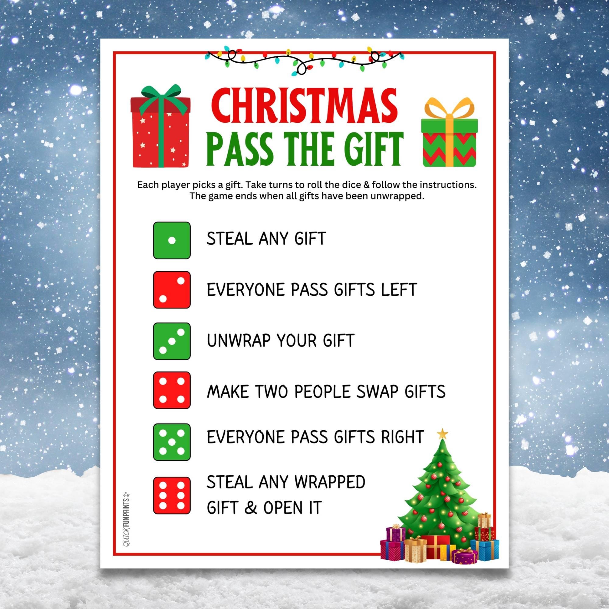 - Take turns rolling the dice and follow the instructions from the 'Pass the Gift' game sheet.