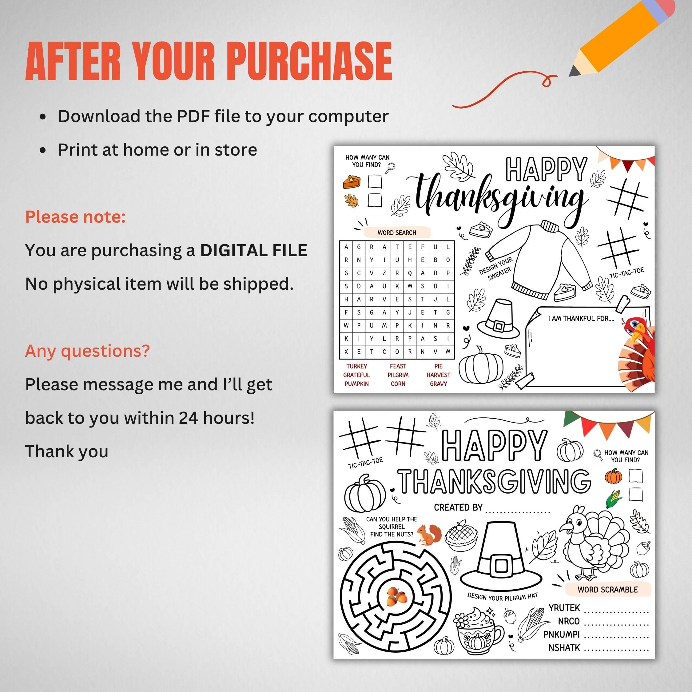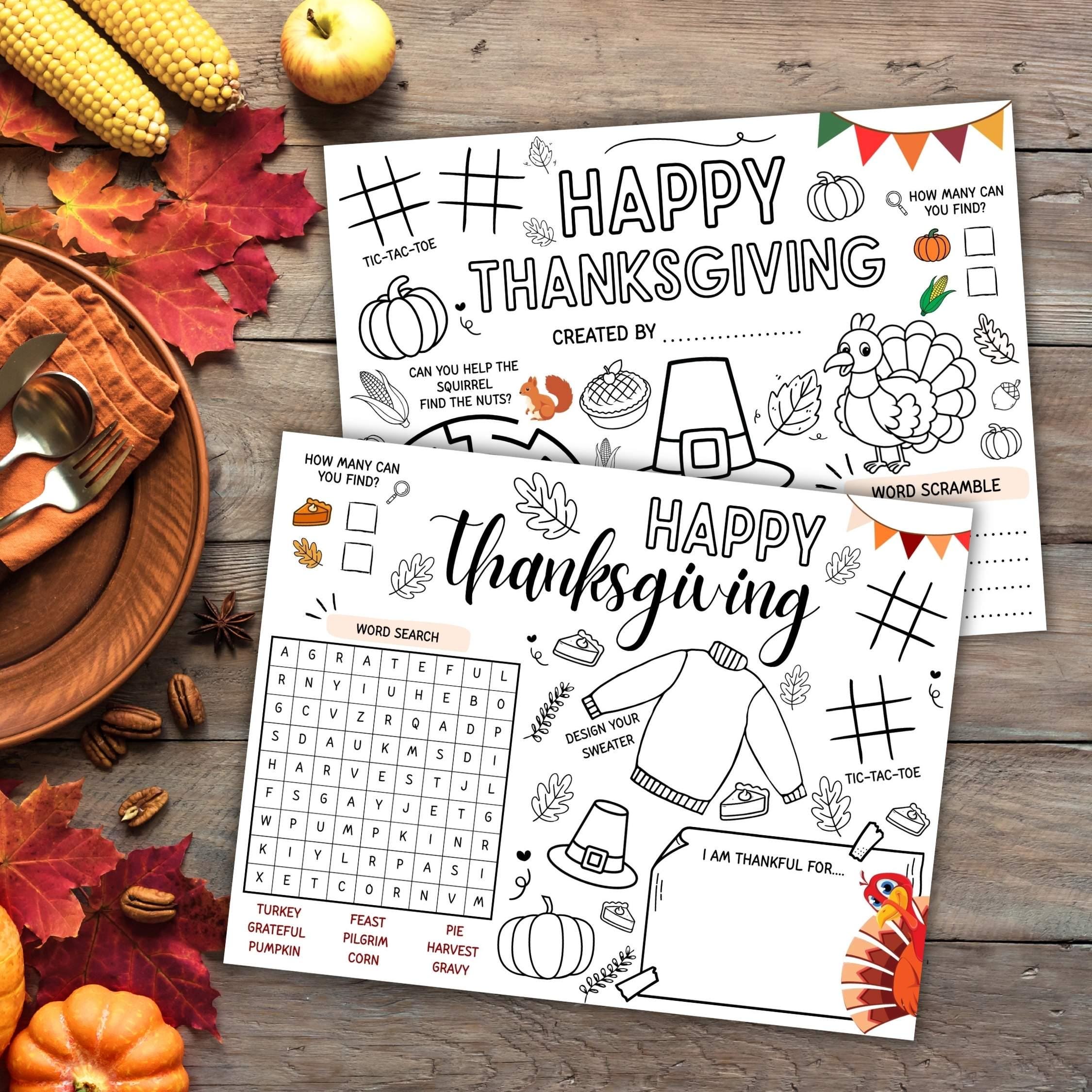 This set includes 2 different designs featuring exciting Thanksgiving-themed activities that will keep little ones busy while the adults enjoy their meal.