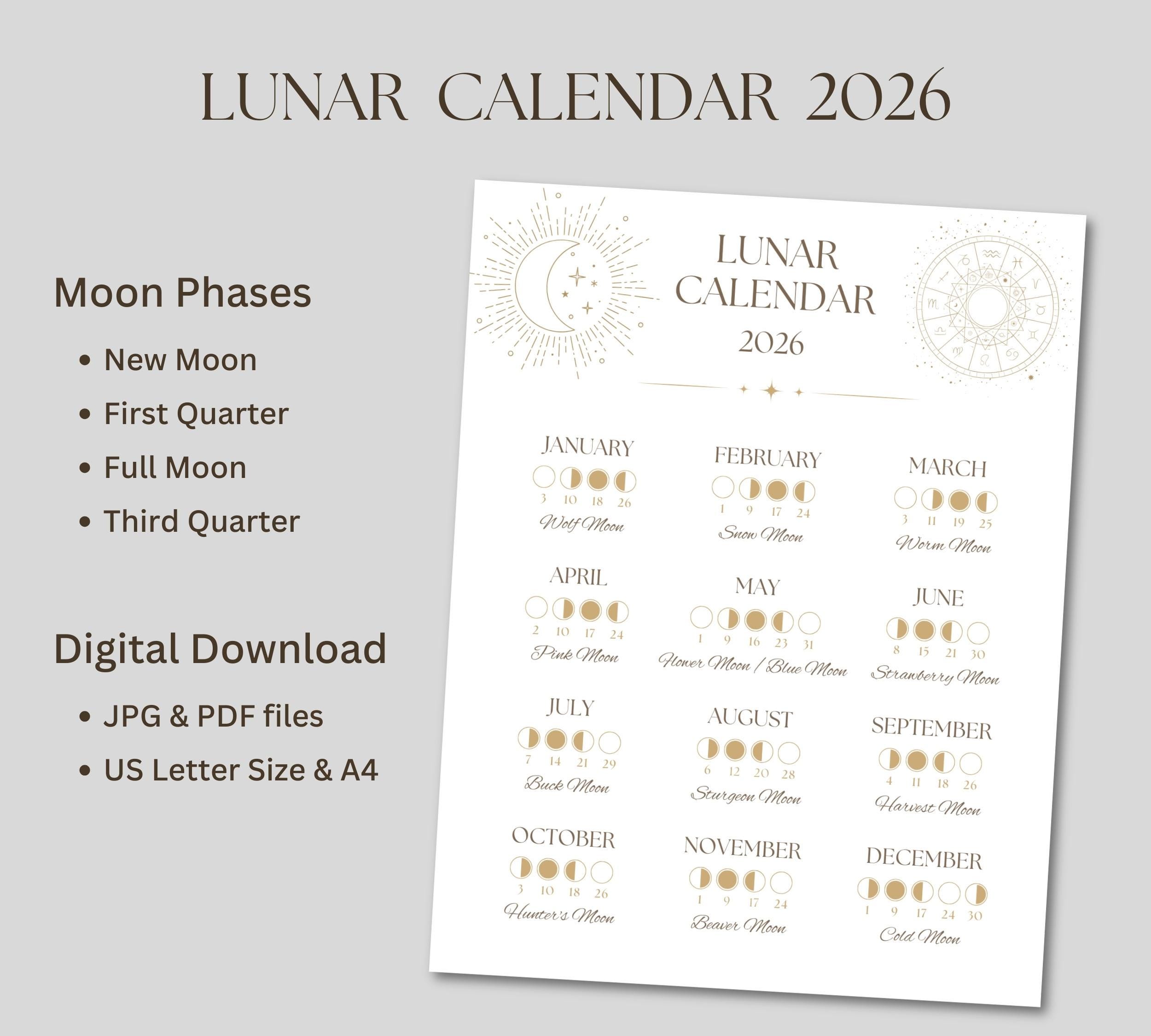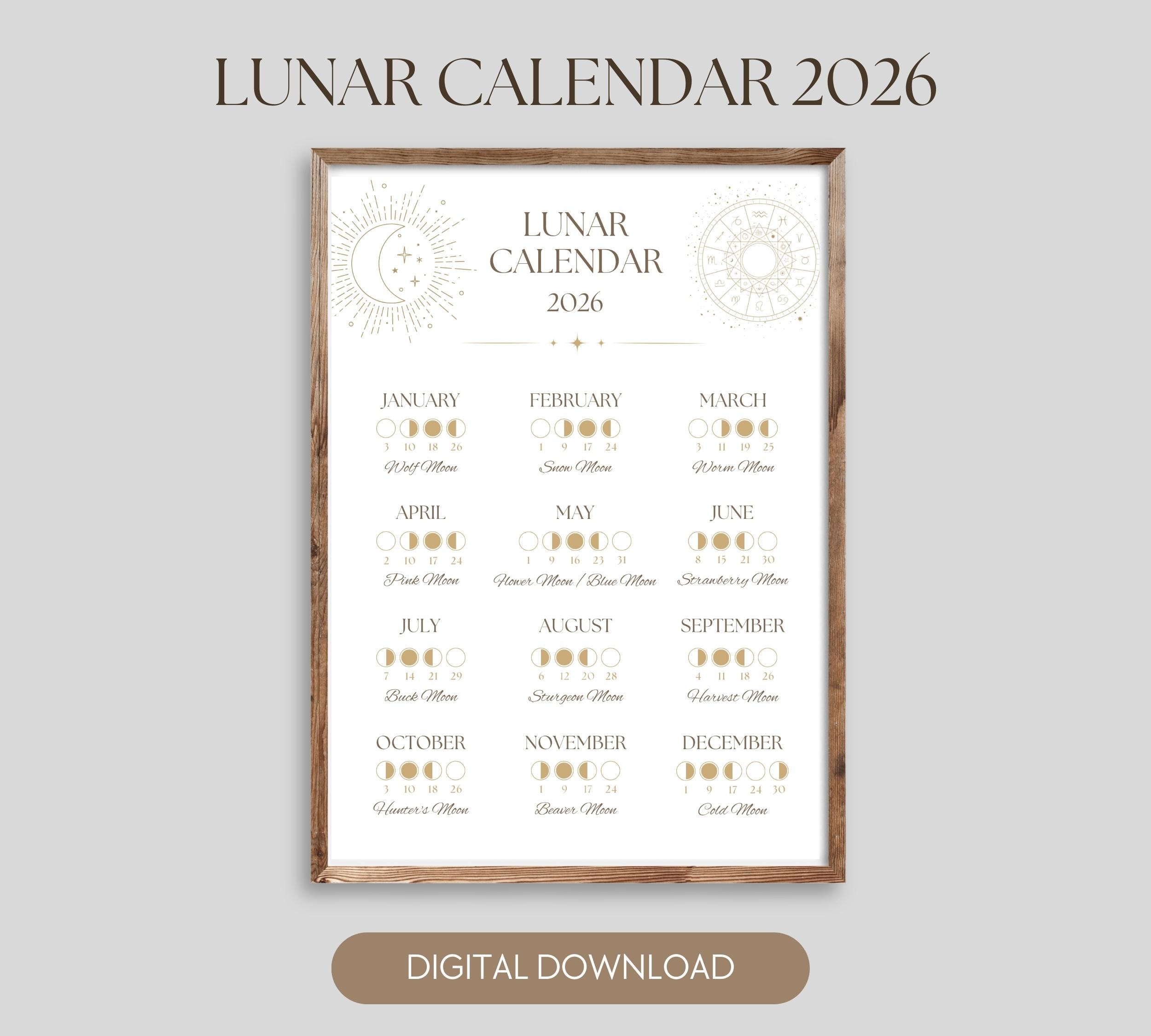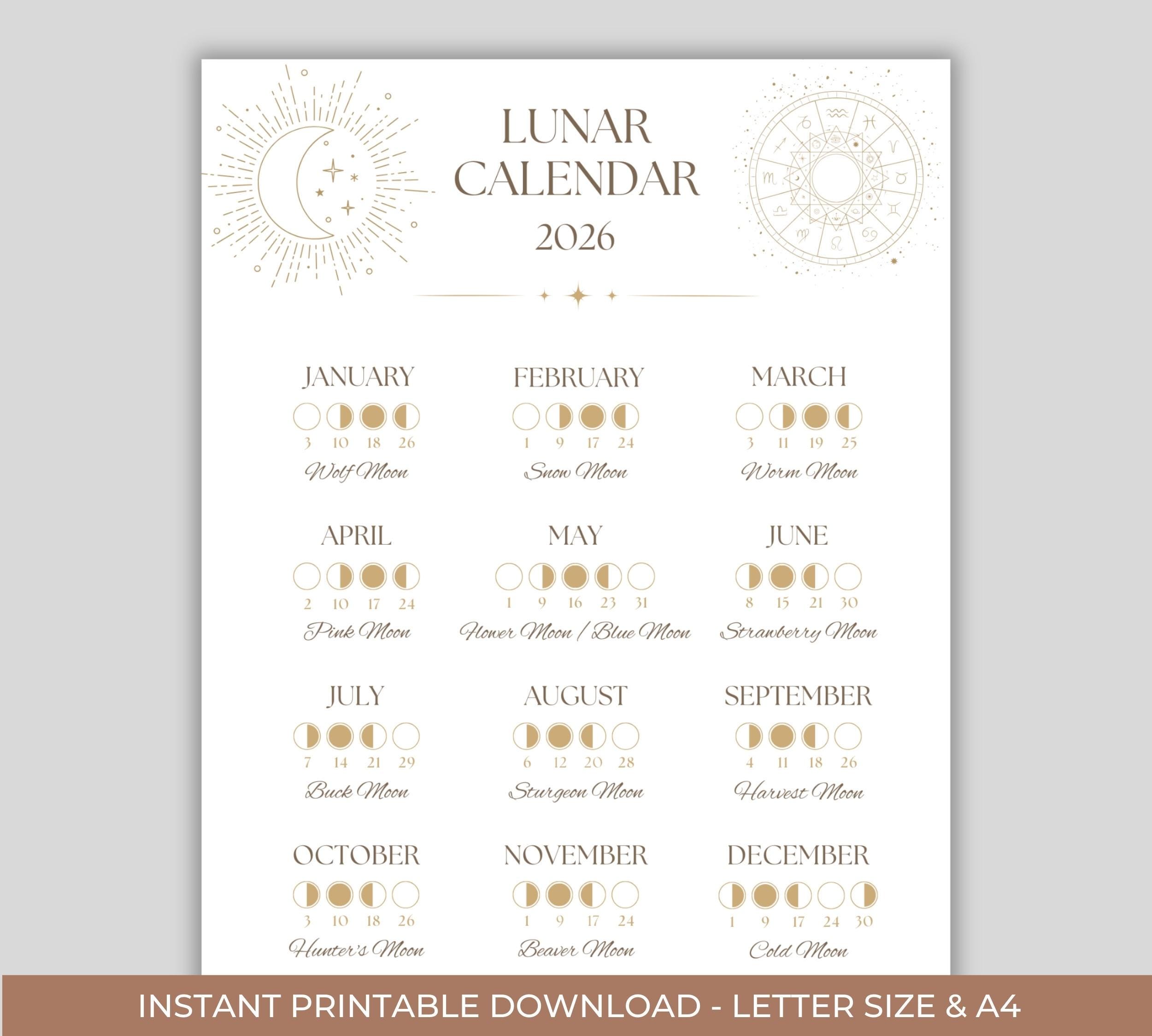 - Lunar Calendar 2026: Complete calendar showing all four major moon phases (New Moon, First Quarter, Full Moon, Third Quarter) for every month