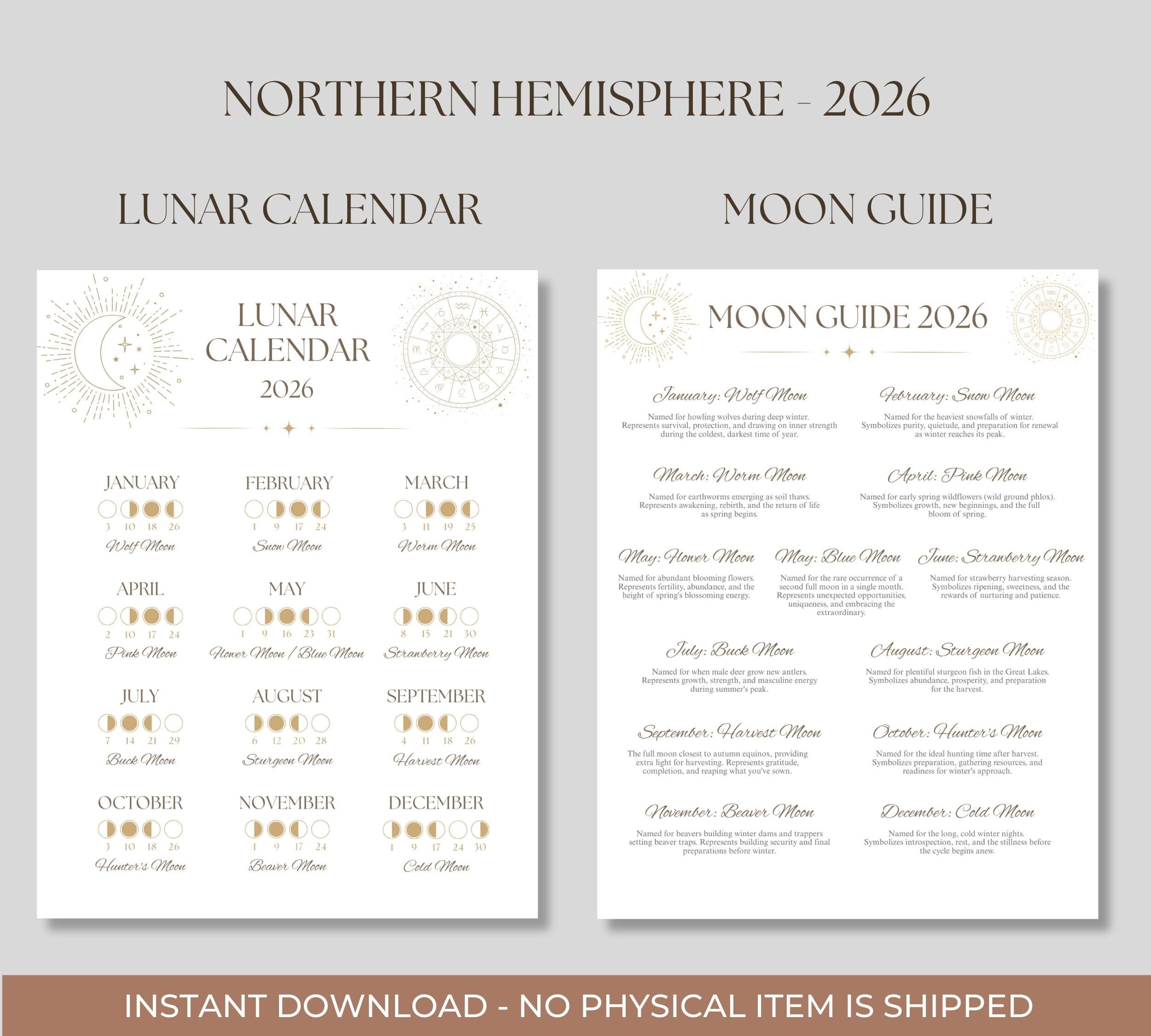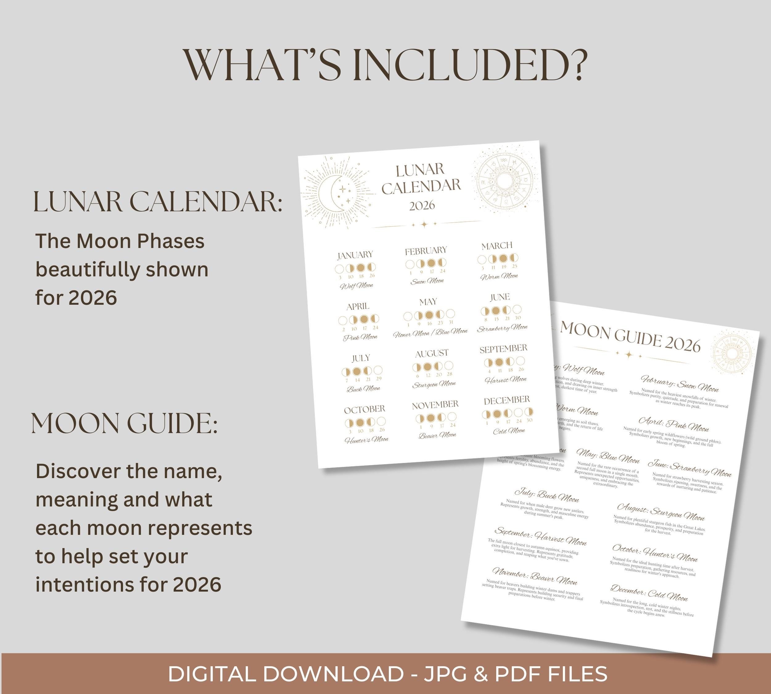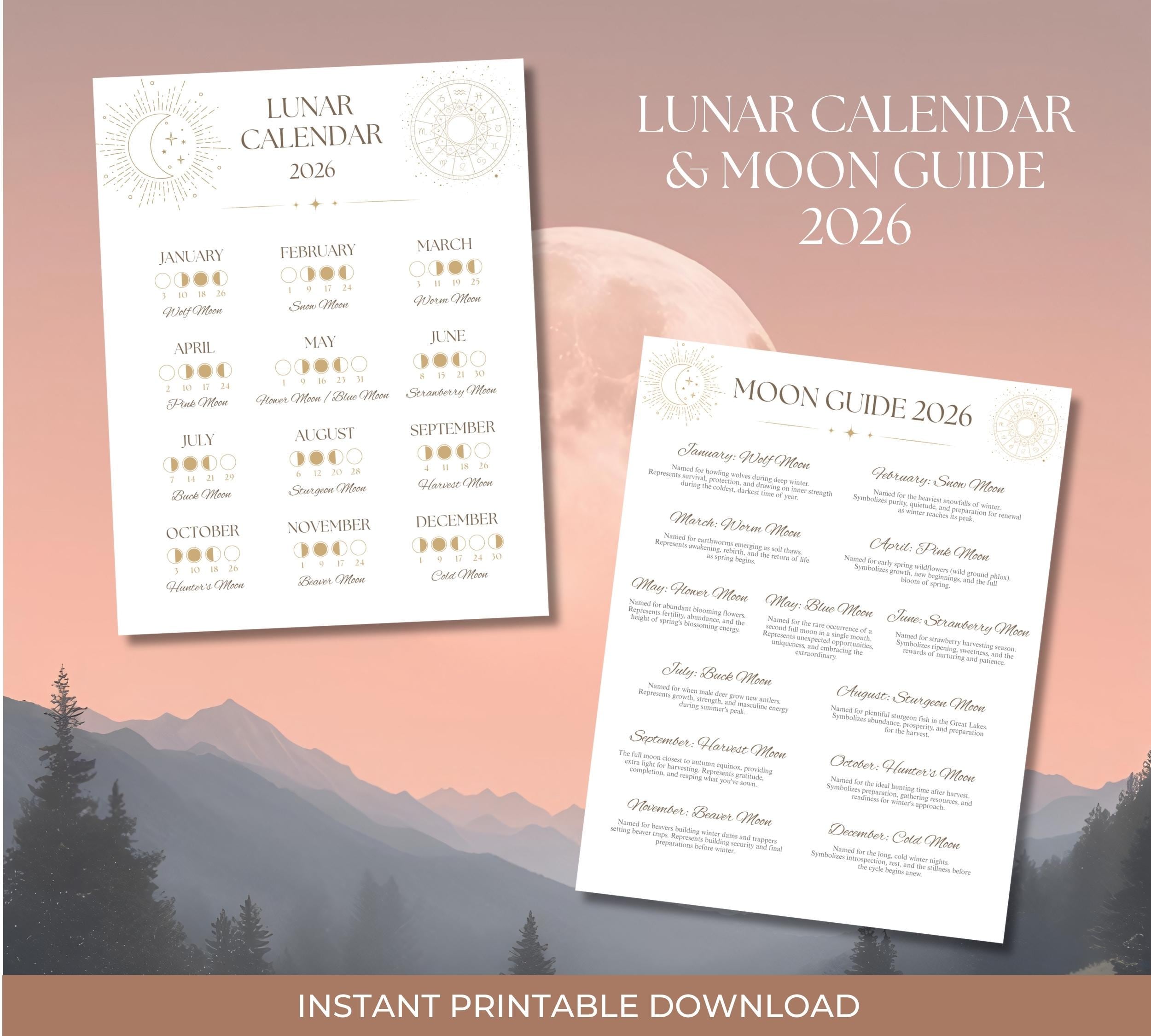 - Moon Guide 2026: Detailed reference guide featuring each month's moon name, meaning, and intentions to set during that lunar cycle