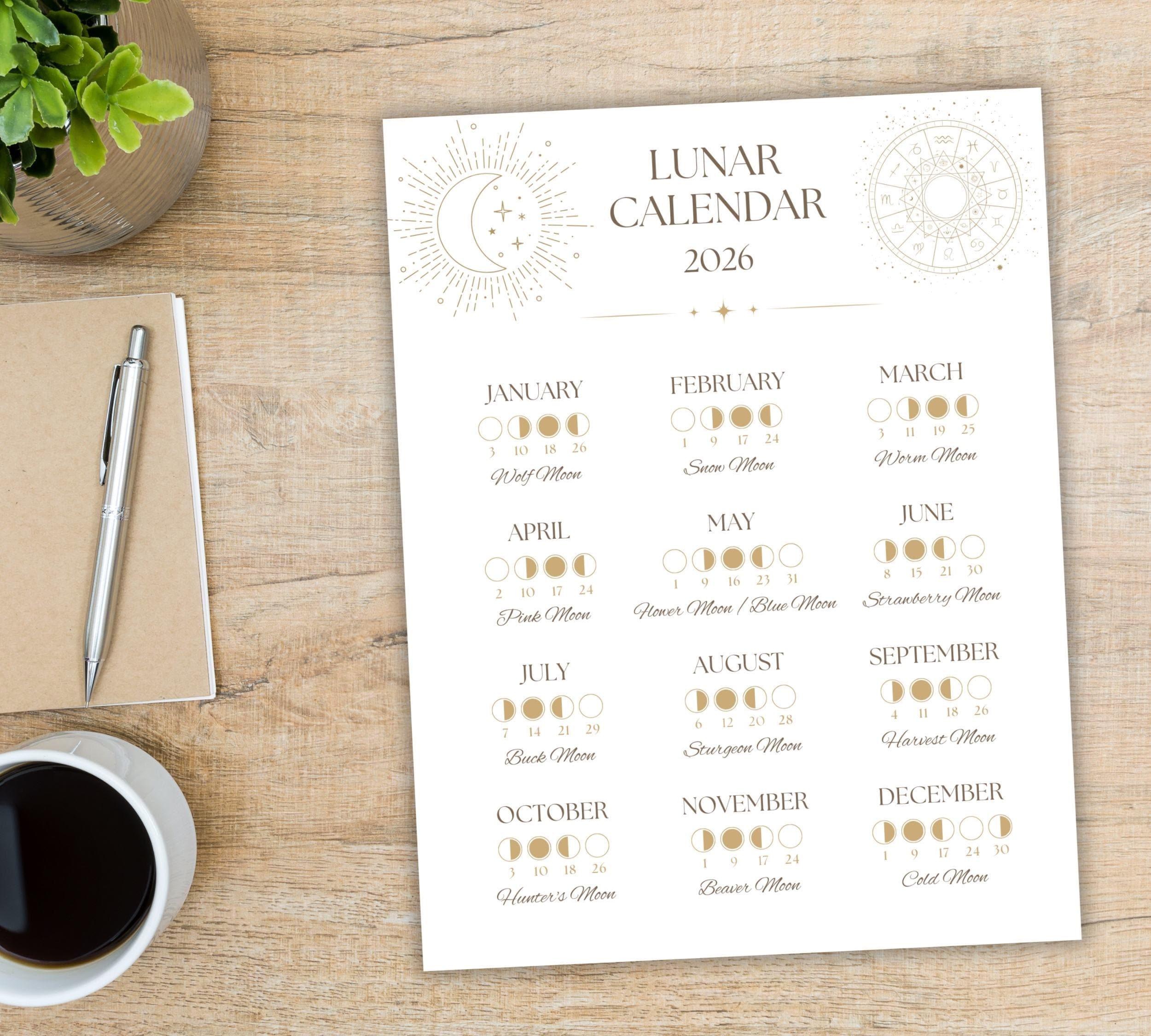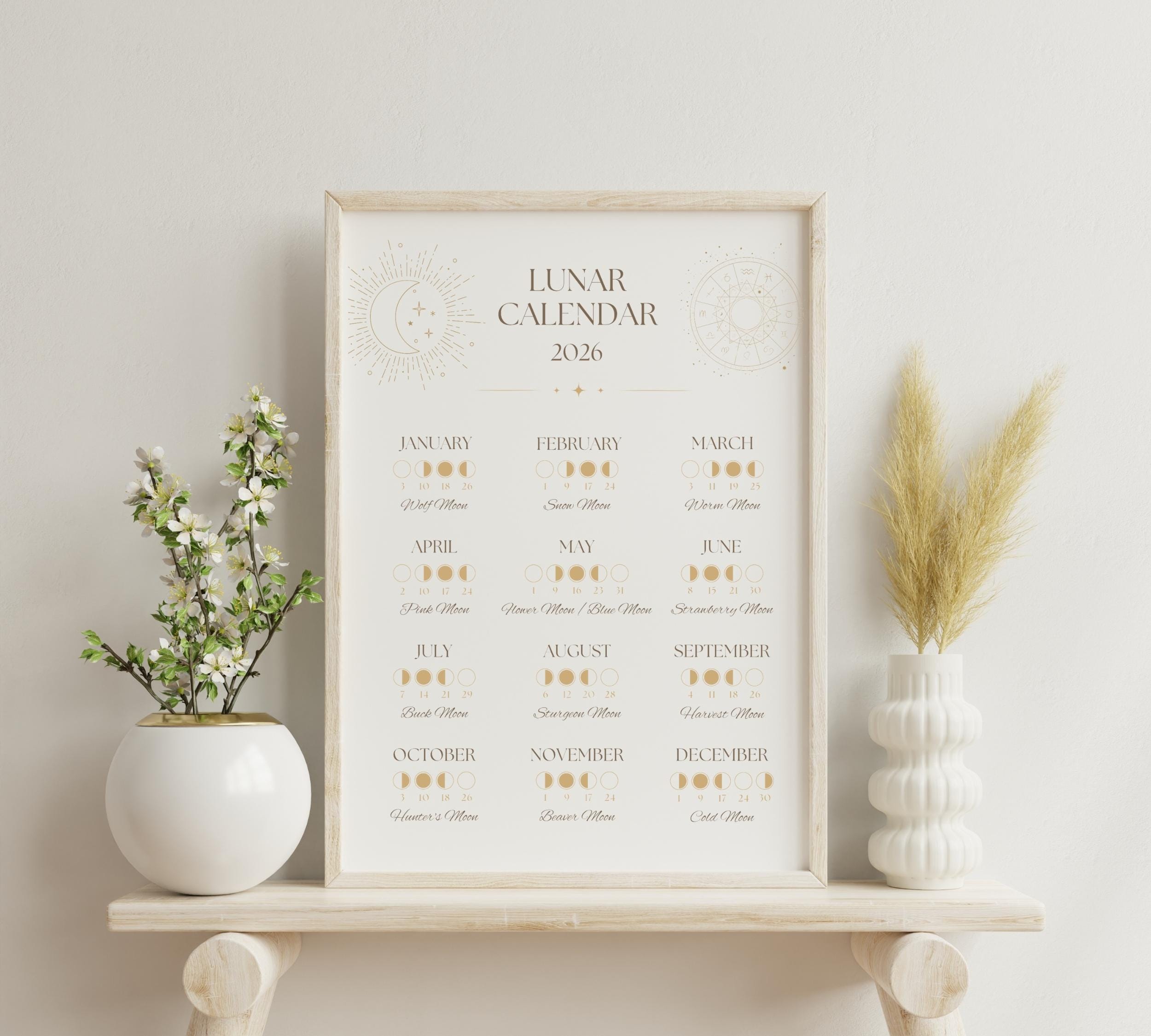 Track the moon's journey throughout 2026 with this beautifully designed Moon Phase Calendar. Perfect for moon lovers, manifestation practitioners, and anyone wanting to align with lunar energy.